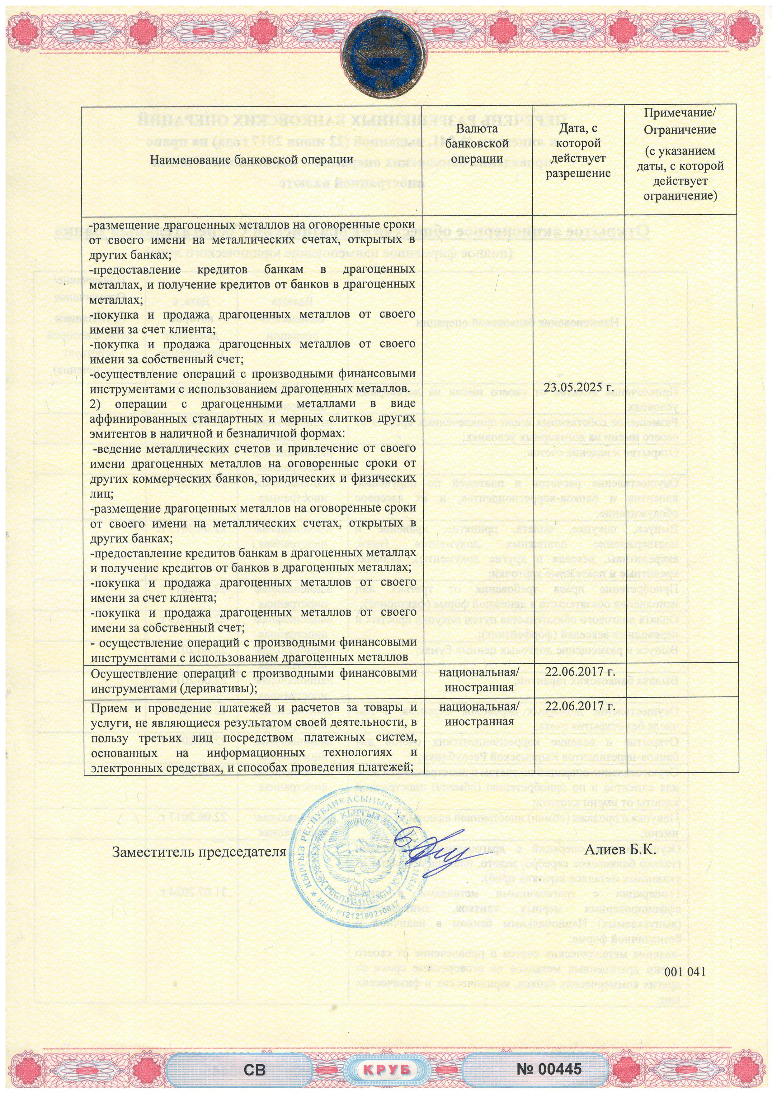 Лицензия Евразийского Сберегательного Банка на право проведения банковских операций в национальной валюте